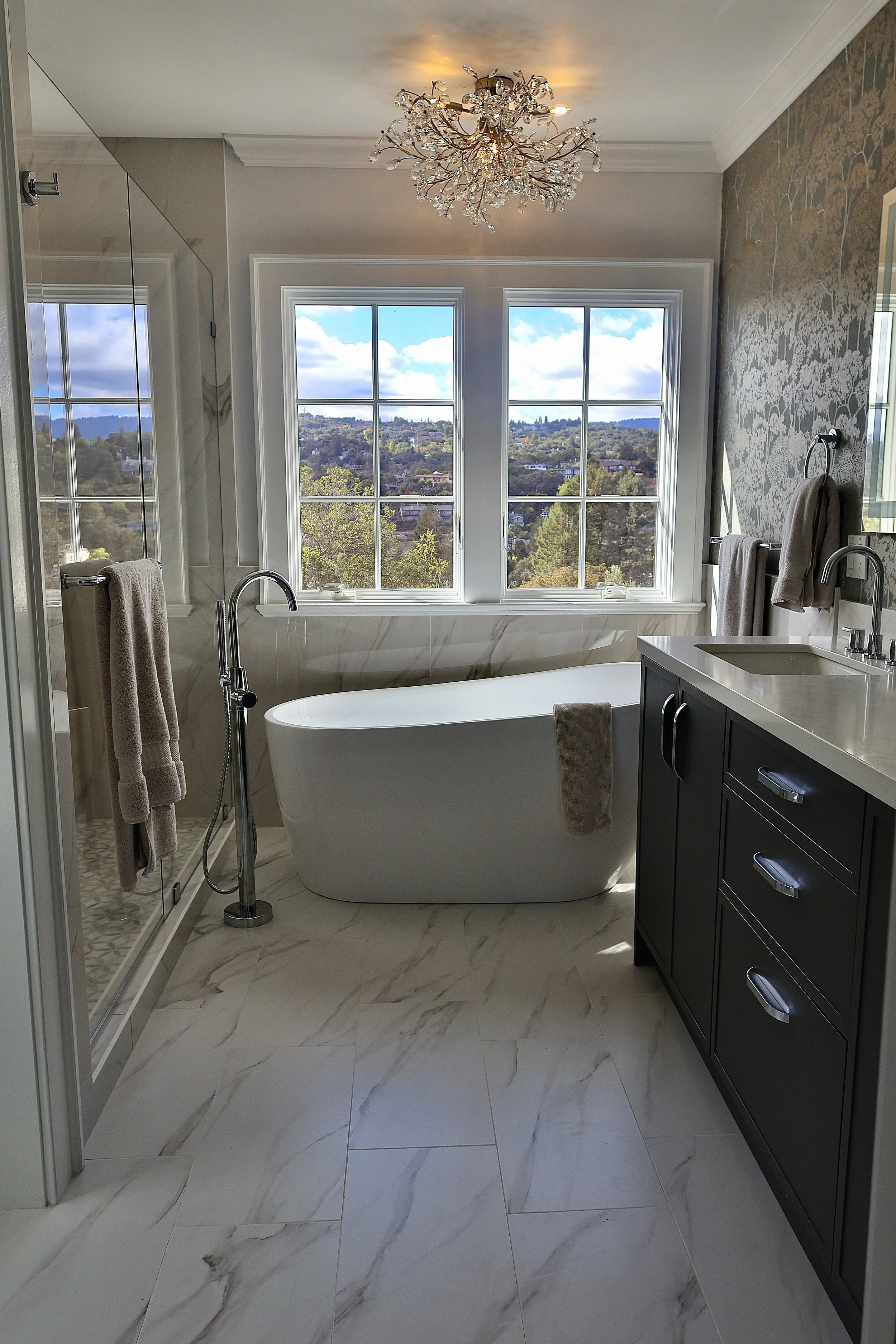 Full master bathroom remodel with custom wallpaper and freestanding tub